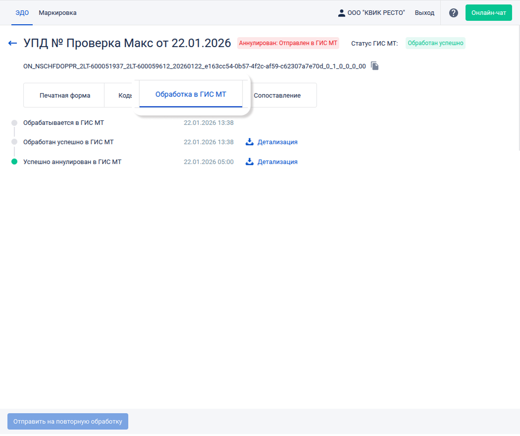 После того как электронный документ будет аннулирован обеими сторонами с использованием усиленной квалифицированной электронной подписи (УКЭП), система ЭДО Лайт автоматически направит данные в ГИС МТ. Это необходимо для корректного учёта перемещения кодов маркировки. ГИС МТ обработает полученный документ, проверит корректность переданных данных, и затем товары будут переведены на баланс соответствующей стороны.