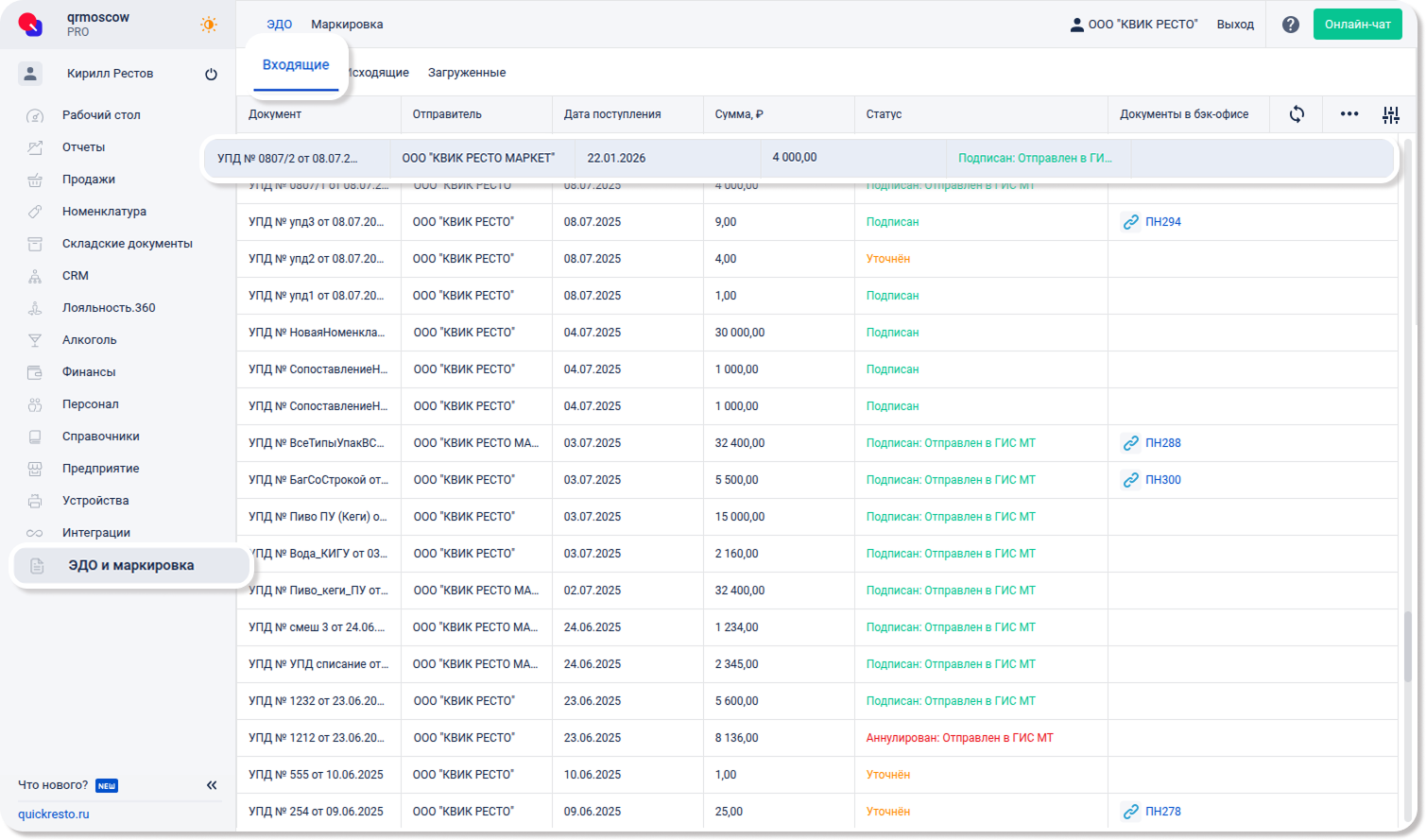 В разделе ЭДО вы можете аннулировать уже подписанные входящие и исходящие документы с помощью электронной подписи (КЭП). Чтобы это сделать, перейдите на вкладку Входящие (Исходящие). Найдите нужный документ в представленном списке и откройте его.