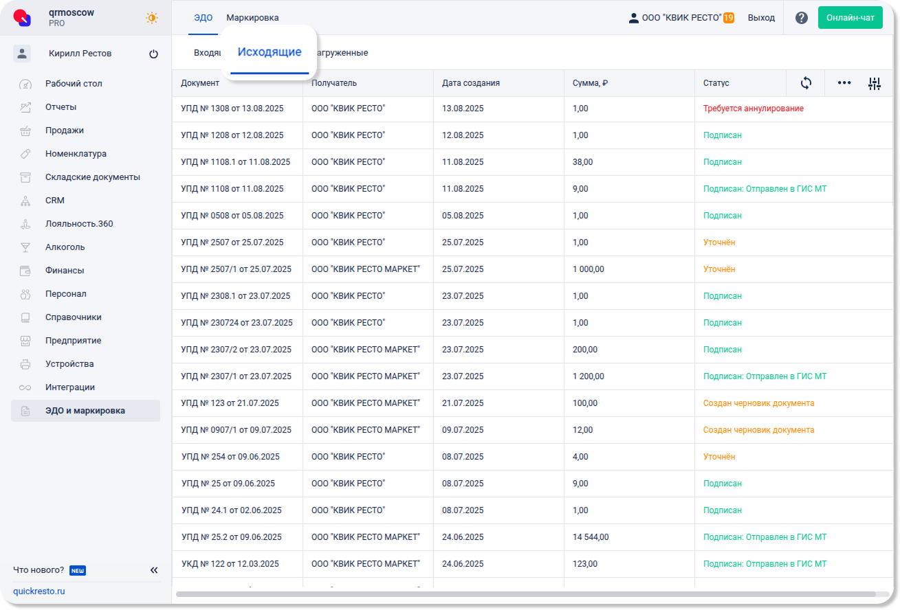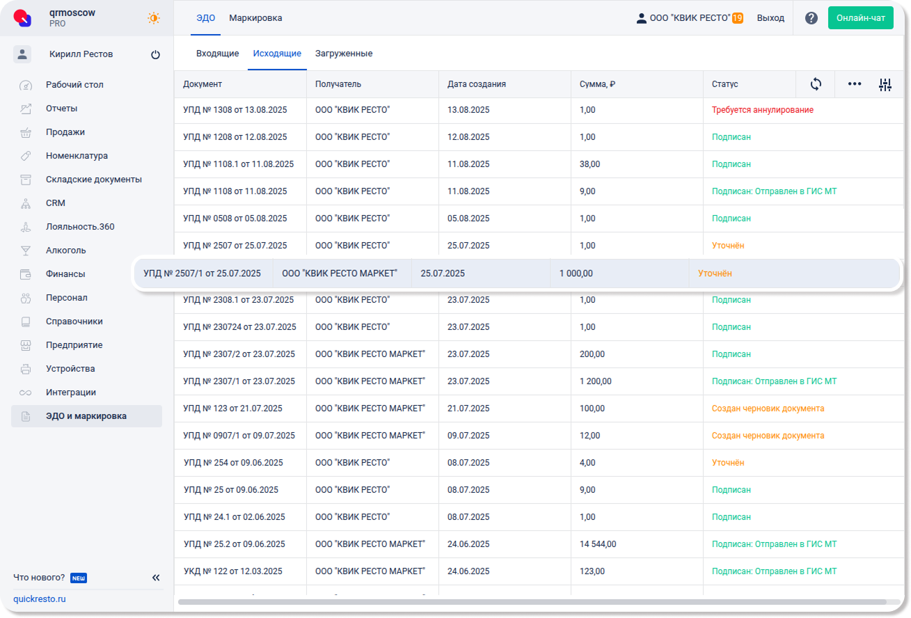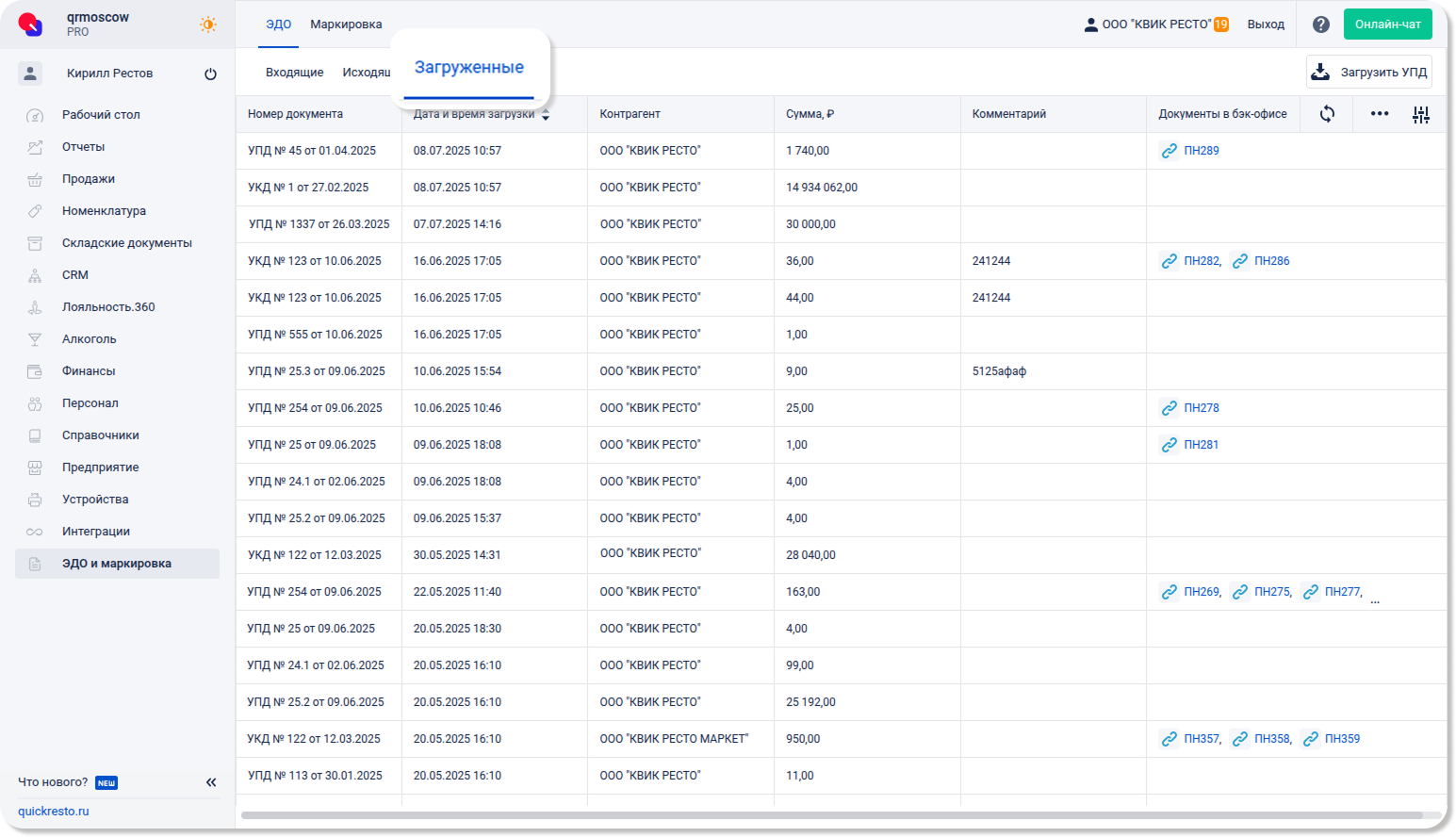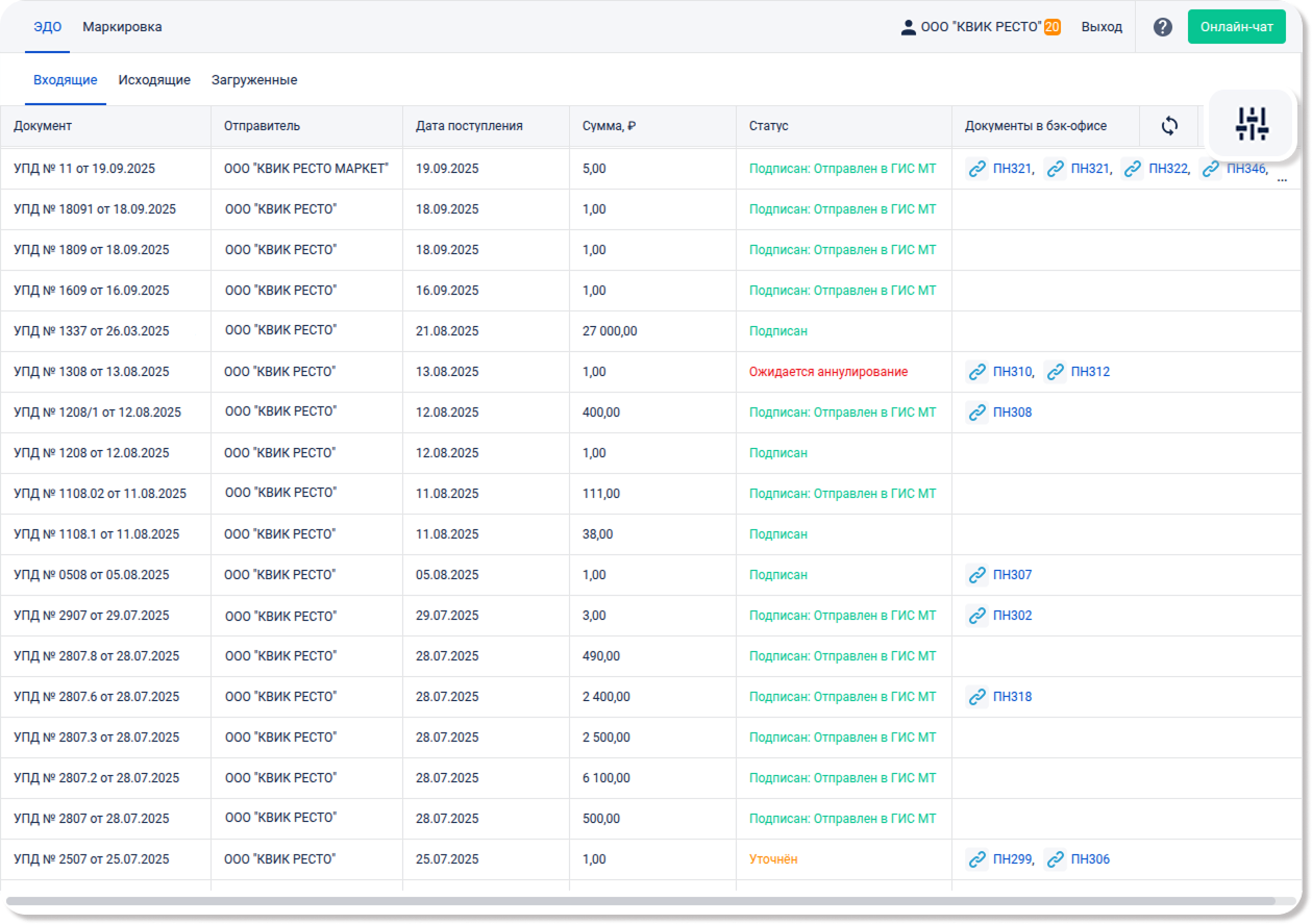 Эта вкладка будет полезна тем, кто хочет загружать УПД из сервисов сторонних операторов ЭДО и экспортировать их в виде приходной накладной в бэк-офис. Она исключает необходимость ручного создания учетных документов и значительно упрощает рабочий процесс.