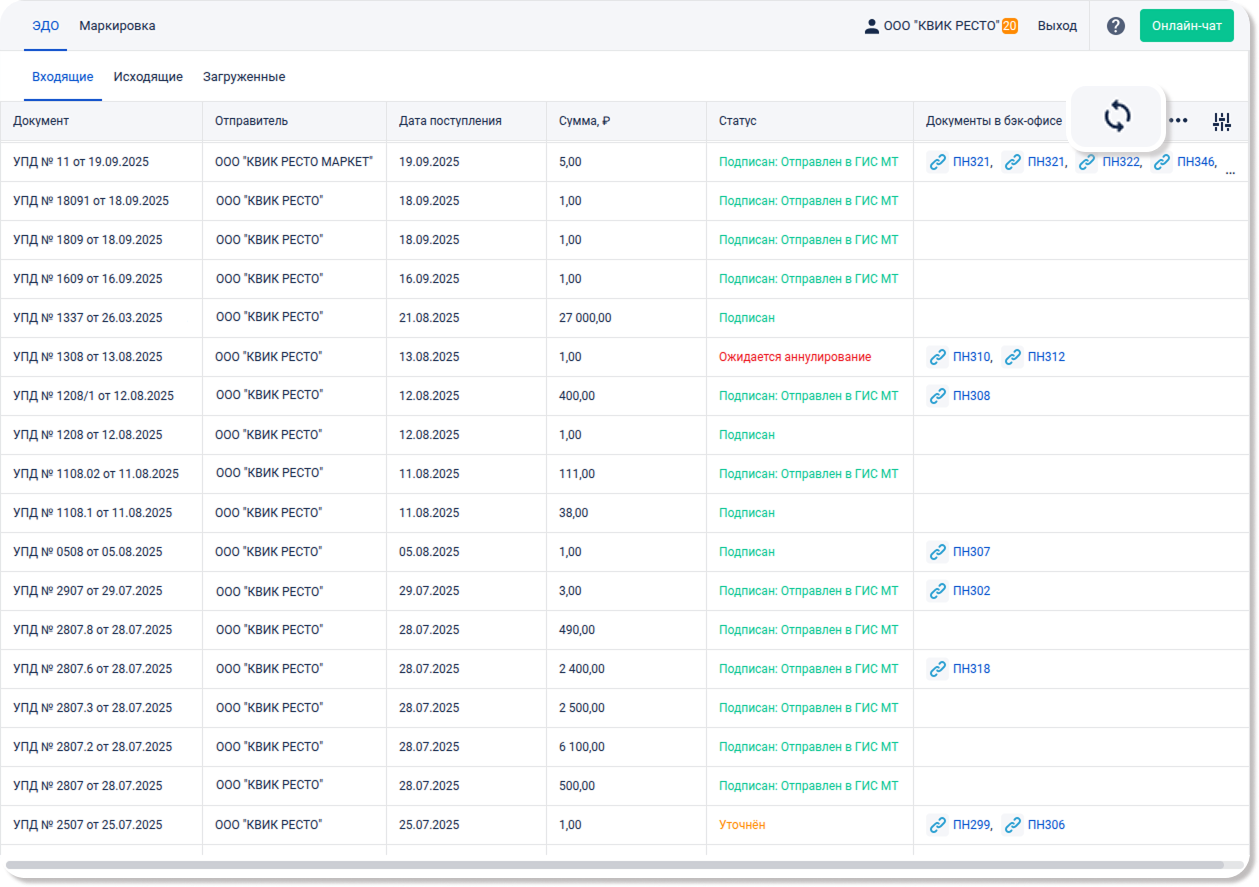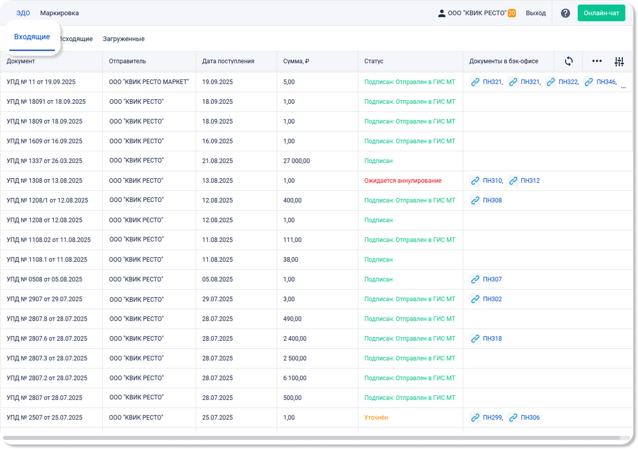 - Сумма, ₽ — общая сумма оплаты по УПД, в рублях.