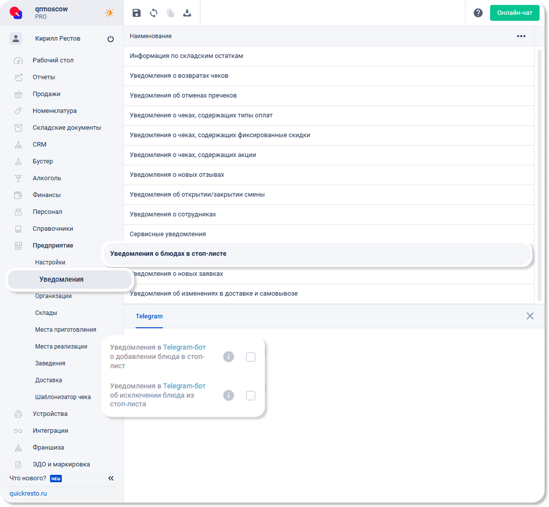 В разделе Предприятие — Уведомления можно настроить получение регулярных отчетов по складским остаткам, а также получение уведомлений в режиме реального времени о различных операциях с чеками, об открытии/закрытии смены, о новых отзывах из продуктов лояльности. Отчеты и уведомления можно получать на Email, в приложение QR Manager, а также в личные сообщения или в групповые чаты в мессенджер Telegram.
