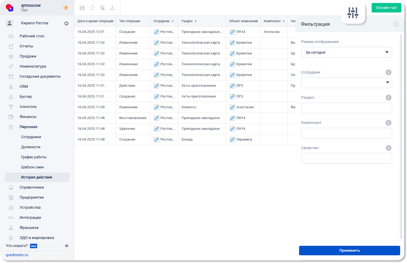 Для просмотра совершенных событий перейдите в раздел Персонал — История действий.