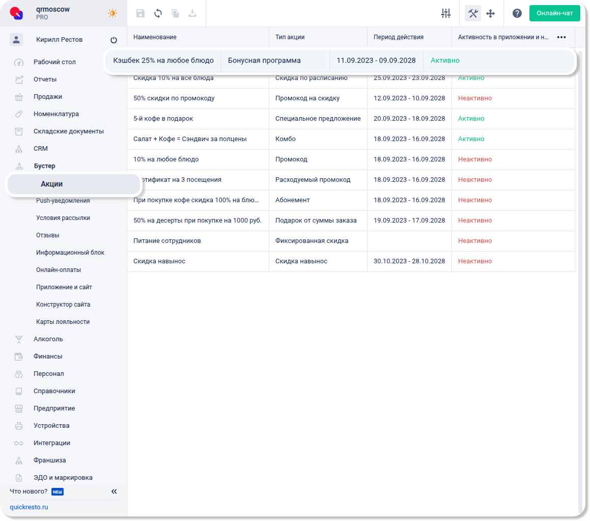 Все бонусные программы, созданные в разделе бэк-офиса CRM — Бонусные программы, отображаются также и в разделе Бустер — Акции.