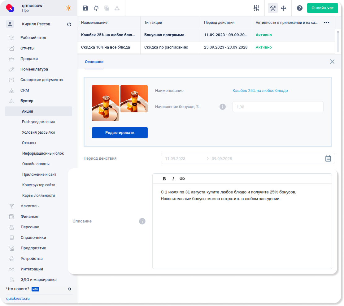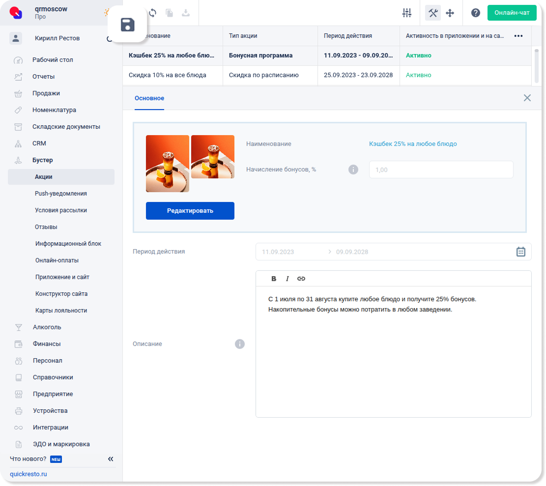 Важно! Бонусная программа перестанет работать и отображаться на сайте заведения, если истечёт срок ее активности или удалить изображение (видео) в настройках.