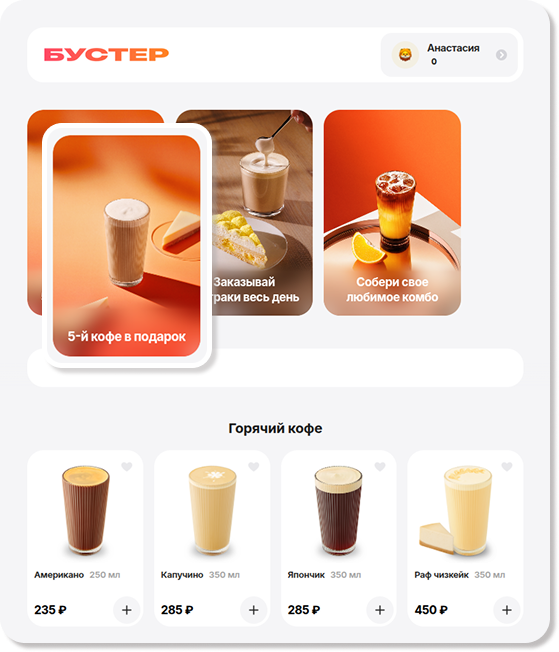 После покупки определенного количества блюд пользователю доступно блюдо-подарок. Оно добавляется в корзину по нажатию кнопки Забрать в подарок или с помощью кнопки «+».
