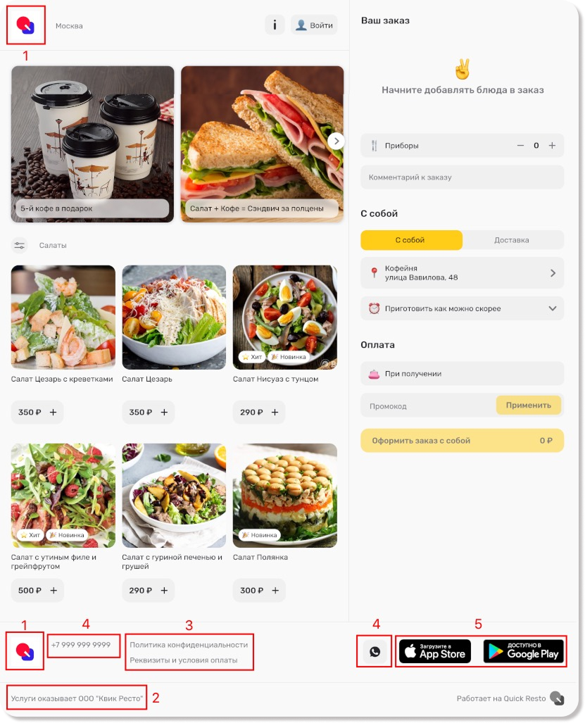 1. Логотип заведения отображается в верхней части сайта и в футере (внизу).