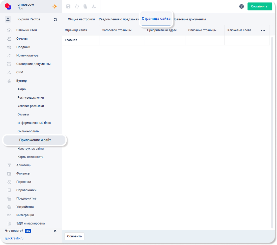 Далее перейдите в раздел Лояльность.360 — Приложение и сайт и на вкладке Страницы сайта пропишите следующие поля для одностраничного сайта: