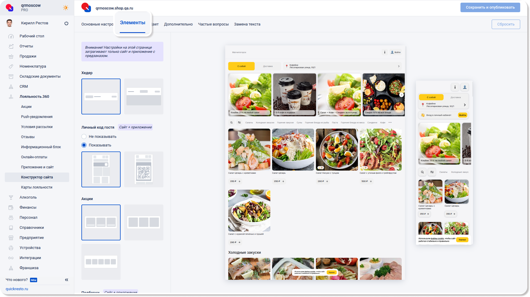 На этой вкладке находятся настройки, которые действуют как для гостевого мобильного приложения и для Telegram-бота, так и для сайта заведения.