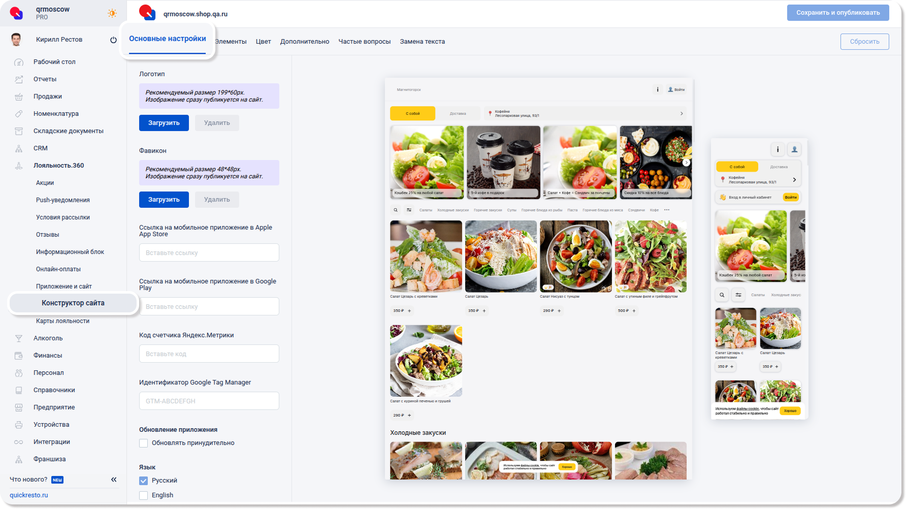 В разделе Лояльность.360 — Конструктор сайта — На вкладке Общие настройки добавьте Логотип, Фавикон и Ссылку на мобильное приложение (необязательное поле для заполнения).
